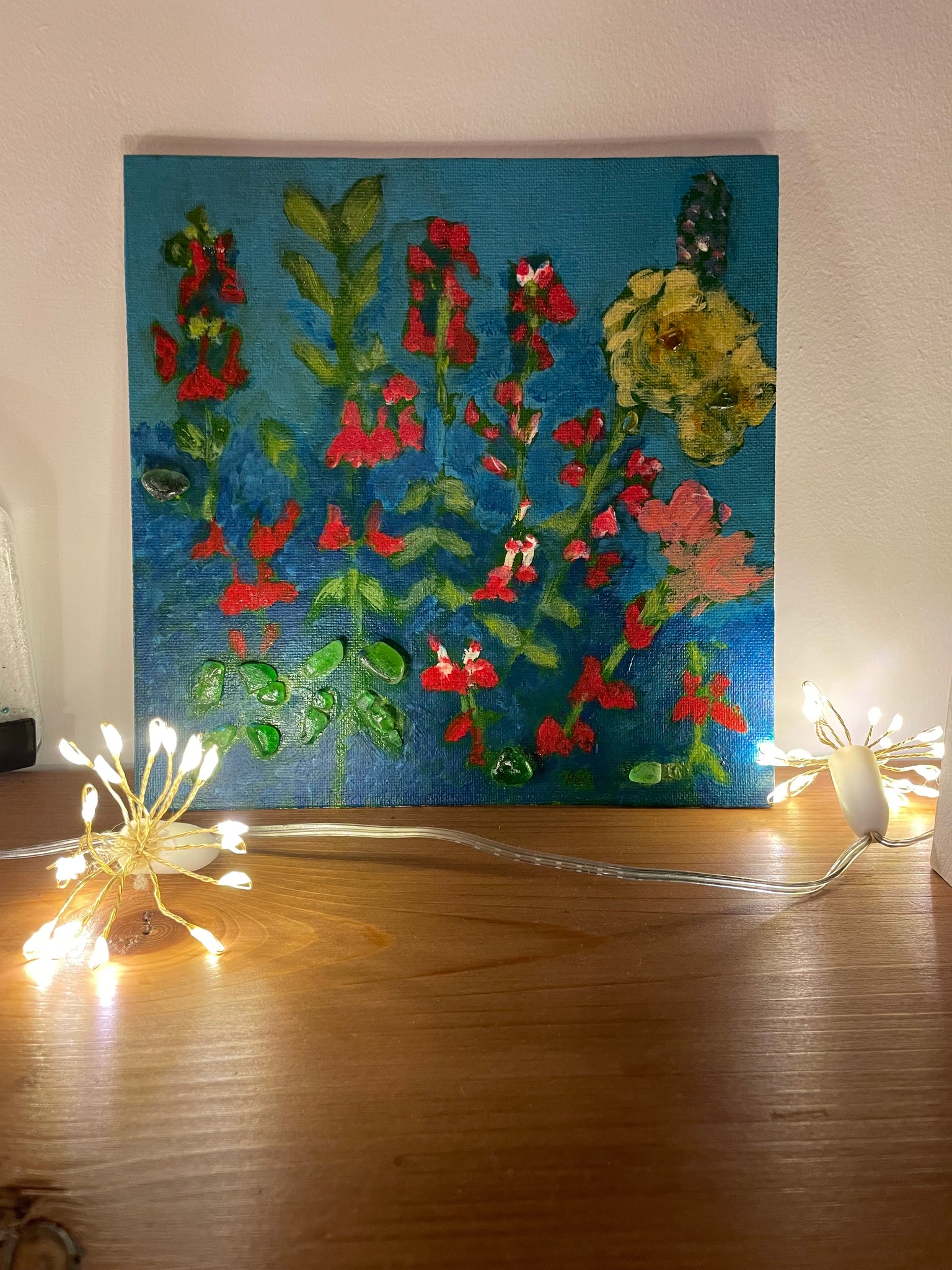 Mixed media on board based upon salvia & yellow roses in my garden.
